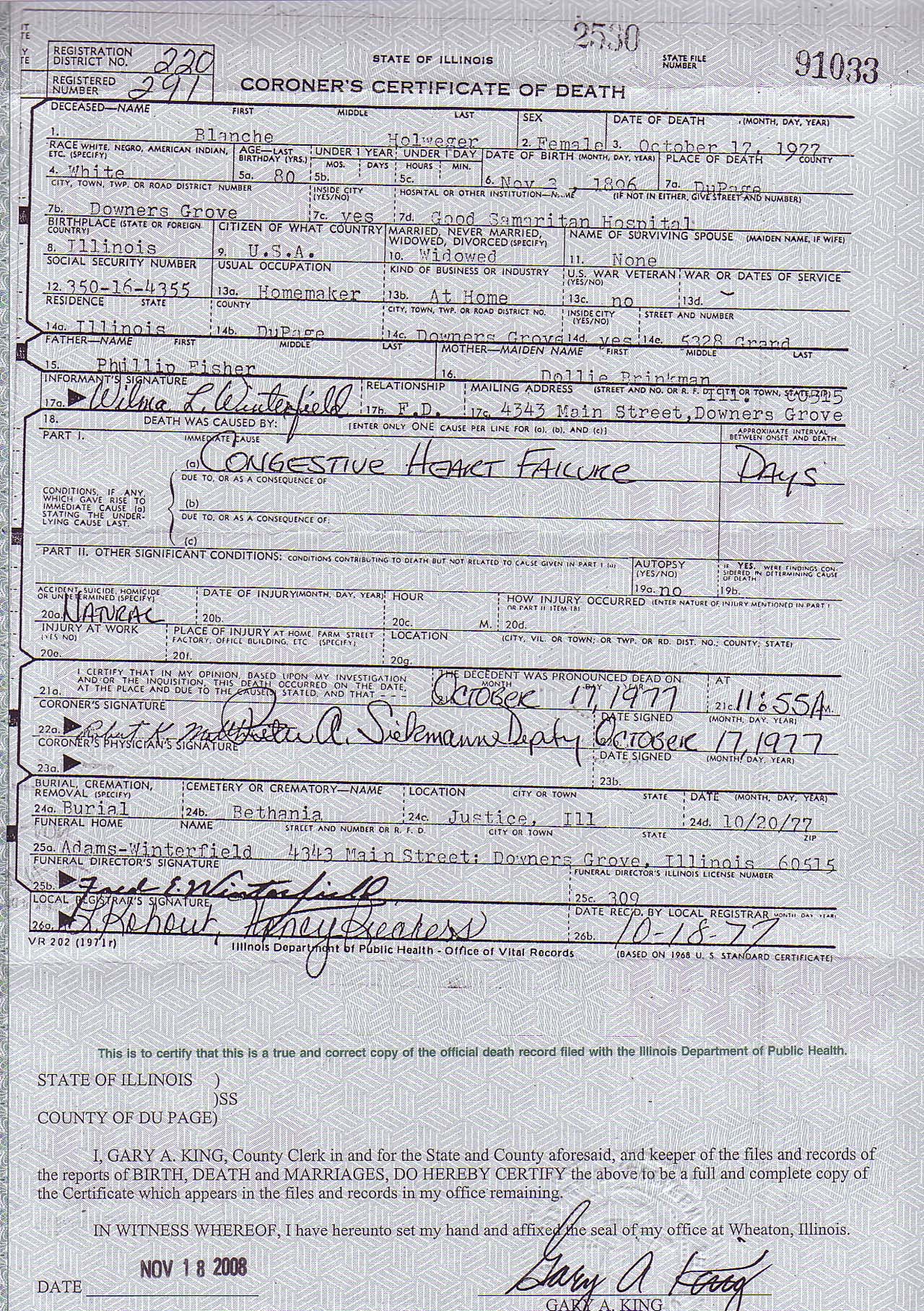Finnally I ordered also the death certificate of Blanche Holweger (nee Fisher). There was also no hint of descendants, because the informant of death was the funeral director. It seems that this line of the family ended here. Here ist the link to the document: