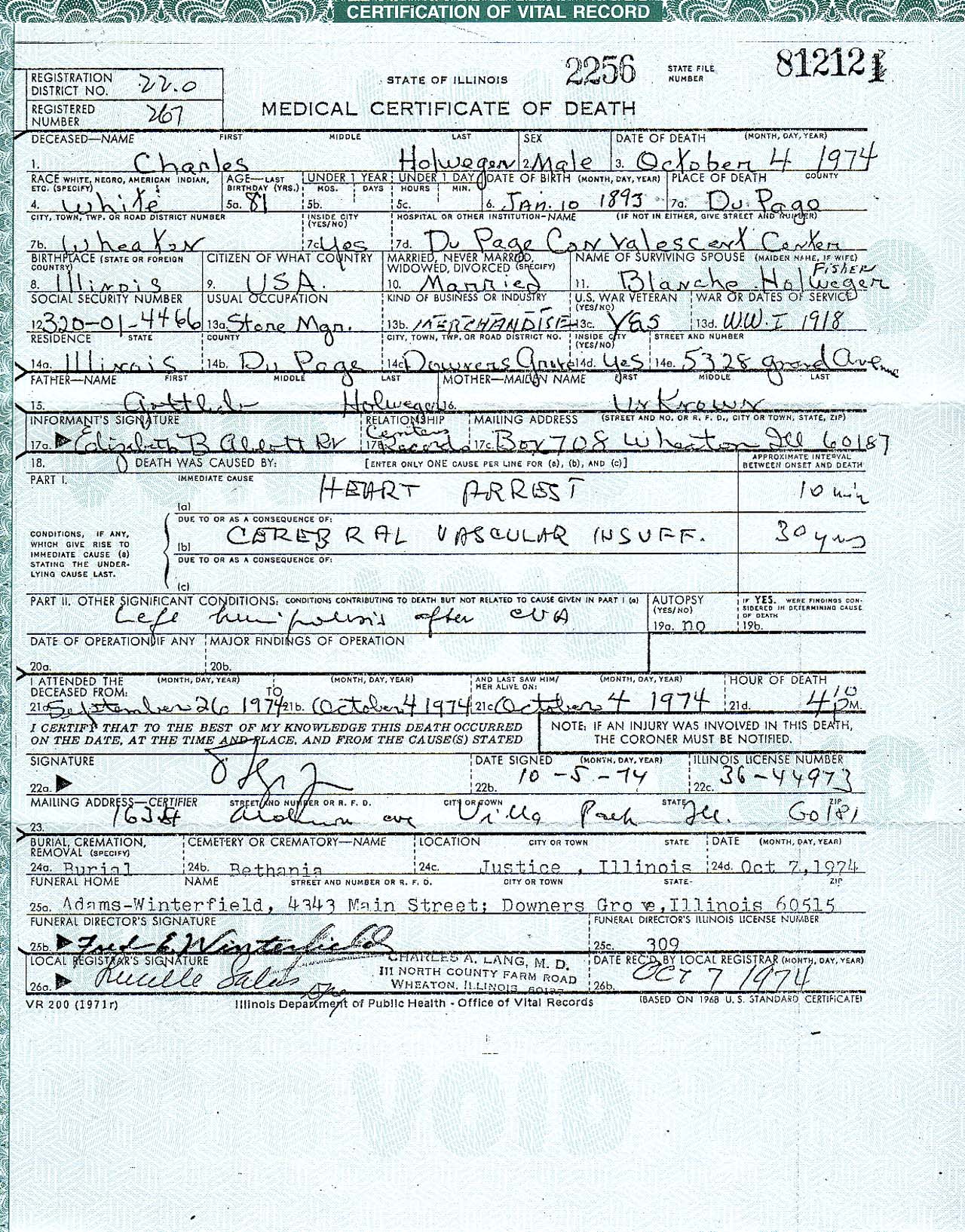 After the weekend with the Jorgensen family end of May 2008 we made a trip to Chicago on Monday. At the office of vital statistics we ordered some certificates. They arrived in Germany some weeks later. There is the death certificate of Gottlieb Holweger, the birth certificate of his son Gottlieb (he named himself later on Charles) and the death certificate of Anna Maria (Mary) Holweger, the sister of Anna Laubengeiger who died 1907, being only 40years old. Vital Statistics could not find the birth certificate of the daughter Mary Holweger, although the family lived throughout the years in Chicago. What we know, the daughter also died very young in 1928 (34 years old). Finally I ordered from Du Page County the death certificate of Charles (Gottlieb) Holweger. On the certificate there are no hint of descendants , because informant of death was someone of the clinic.